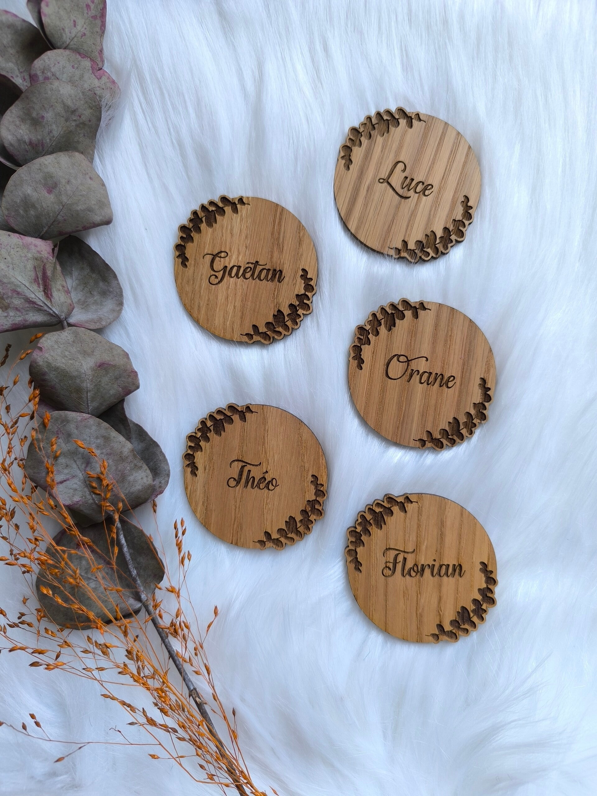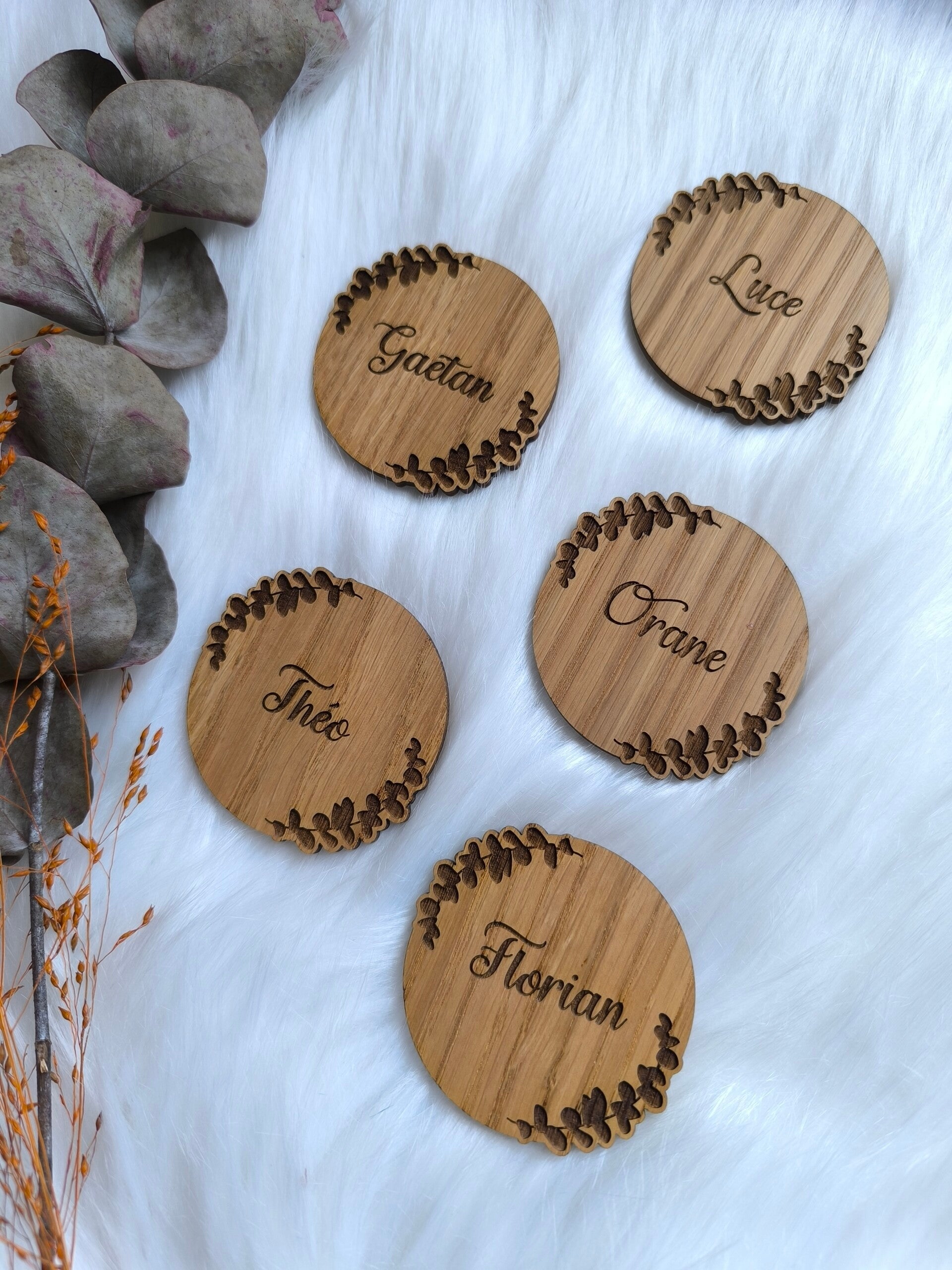 Marque place mariage en MDF contreplaqué chêne épaisseur 3mm, diamètre : 6.2cm