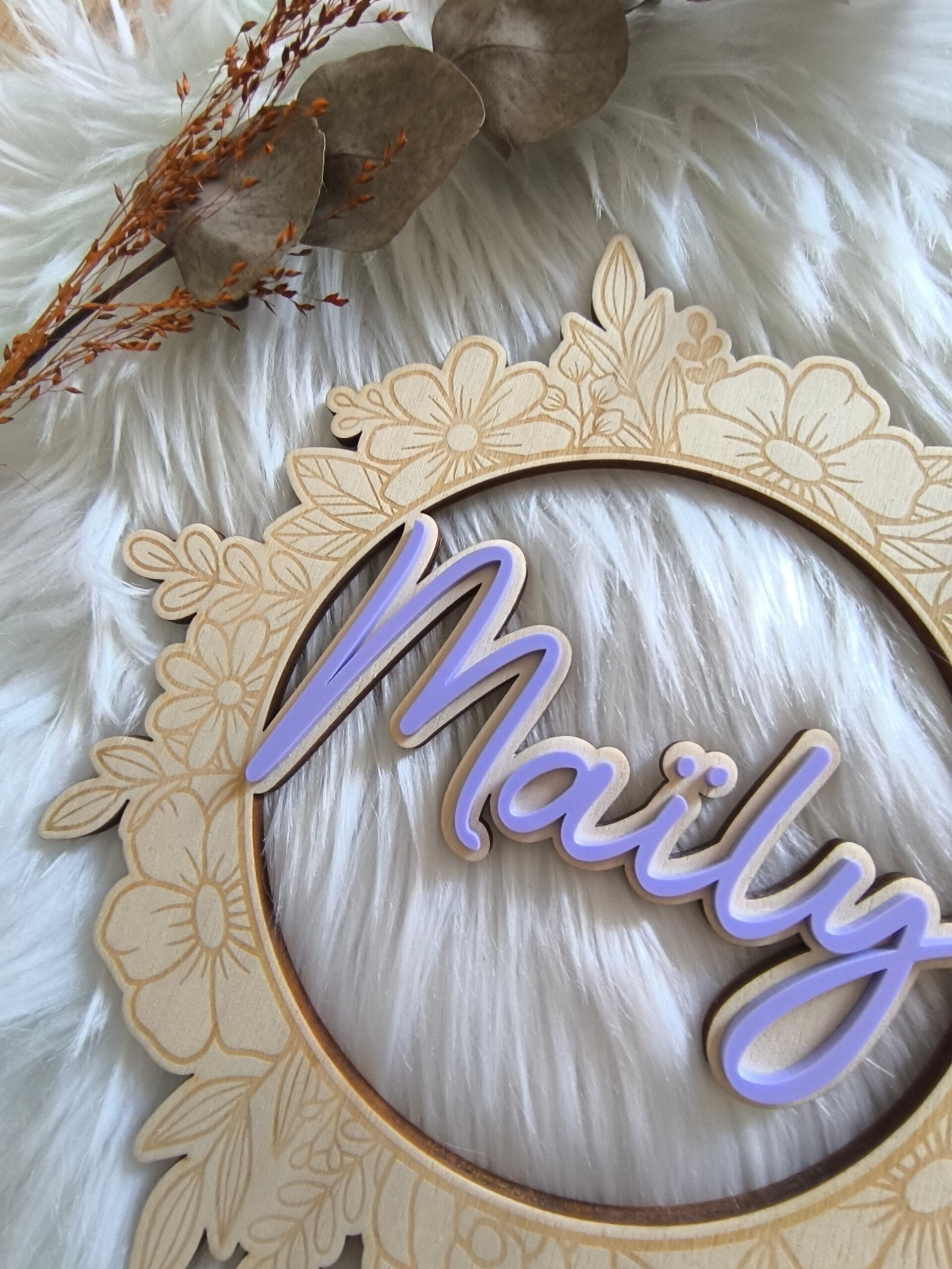 Couronne florale pour décorer une chambre de petite fille par exemple.Dimensions 25cm ou 30cm de diamètre au choix.Couleur du plexi au choix aussi.